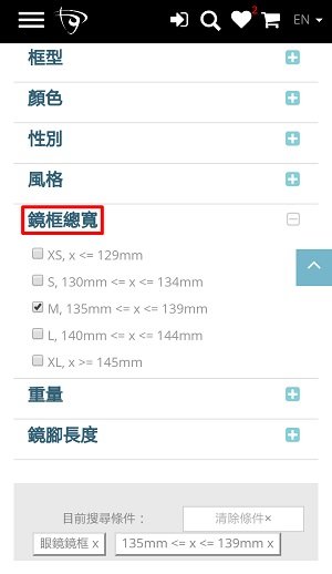 ▾畢竟在網路上配眼鏡,無法像實體店面那樣,可以試戴並馬上知道眼鏡尺寸適不適合自己,建議使用這裡的精準搜尋,來找到適合自己的眼鏡尺寸,關於如何測量自己的眼鏡尺寸,請參考官方教學。「眼鏡總寬」與「鏡腳長度」是挑選鏡框最重要的尺寸資料,如果不是選擇多焦或雙焦,基本上可以比對你舊眼鏡的「眼鏡總寬」與「鏡腳長度」即可。