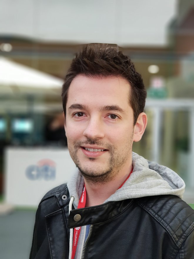 Galaxy S9+前鏡頭與Galaxy S8一樣,都是1200萬畫素,光圈f/1.7,拍出來不錯,但沒到很出色的程度。前鏡頭的拍照功能有「人像模式」功能,要注意的是使用這項功能時會把背景進行模糊處理,因此頭髮邊緣可能會一併變模糊。