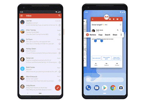 Android 9.0還加入新的系統導覽功能,過去畫面下方「返回」、「桌面」、「程式切換」三個按鈕改成「返回」與底部一條短橫條,在任何程式畫面的底部做向上滑動手勢可以檢視近期開啟的程式(見下方左圖),而且特別的是,你不需切換至該程式,在檢視狀態的畫面就可以直接選取縮圖裡的文字,進行複製、搜尋、分享等動作(見下方右圖,不需完整切換至Gmail畫面,在檢視近期開啟畫面這裡就可以直接選取「Cascal」然後看是要查看這家餐廳的評論,或是純粹複製Cascal文字,然後進行搜尋、分享)。
