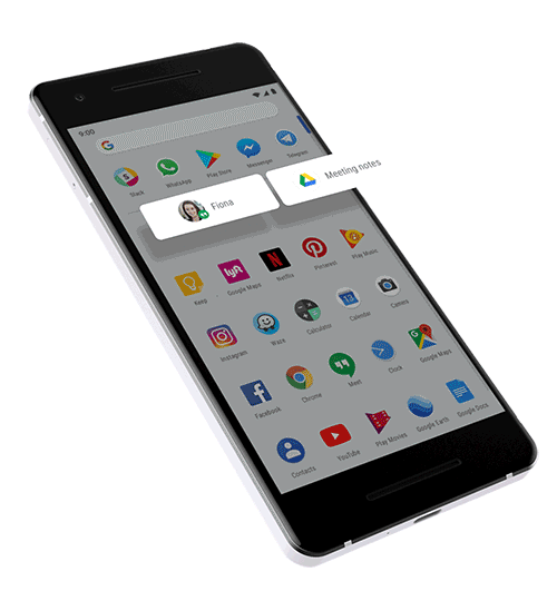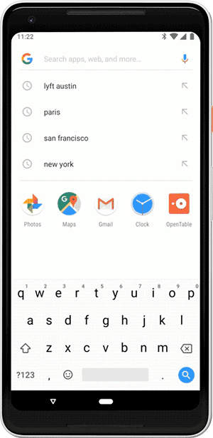 其它機器學習功能還包括提升經常使用程序的開啟速度。「Slices」則是新功能,它讓app可以直接「崁入」搜尋結果頁,例如你不必開啟Lyft,直接在Google app就可以進行Lyft的搜尋,Lyft並且會以Slice(卡片型式)顯示回家或是工作目的地的選項,也就是說在Google app裡可以使用Lyft這支app的功能(例如搭計程車),不必另外開啟Lyft。以下是在Google app裡的Lyft的資訊卡片。
