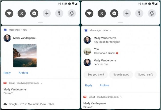 通知中心選單的圖示改成圓形元素,訊息通知可以收納,展開預覽時有智慧回覆選項,例如回覆、封存、或是罐頭訊息如「See you then - 到時候見」、「Sounds good - 聽起來不錯」、「Sorry, I can’t - 抱歉,我沒辦法」。