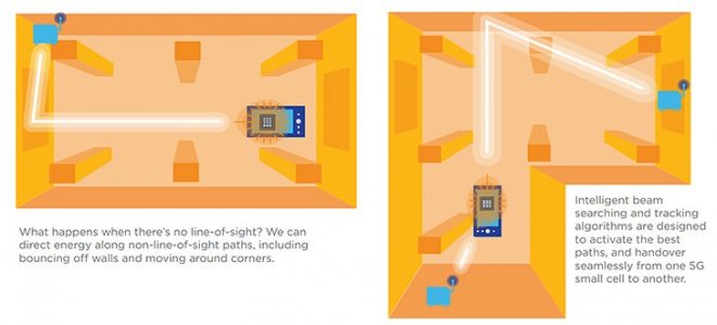 由下圖圖解來看,經由反射訊號,將支援智慧束波搜尋與追蹤演算,來達到最佳連線傳輸路徑,並且在不同台的5G微細胞基地台間無縫切換。