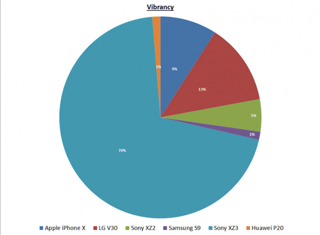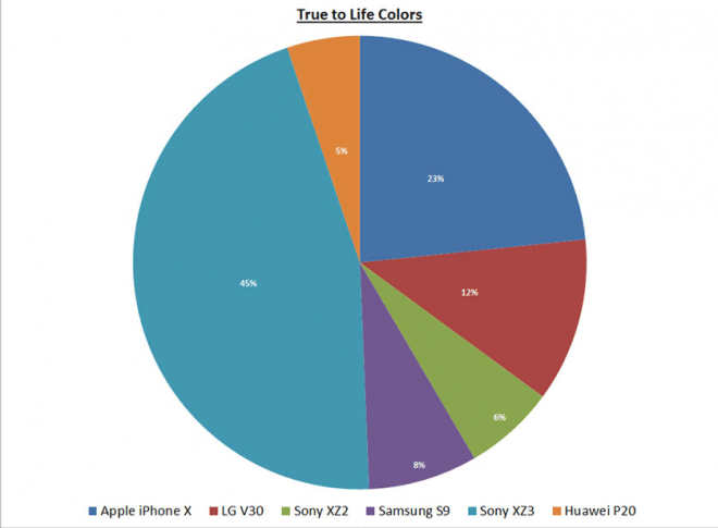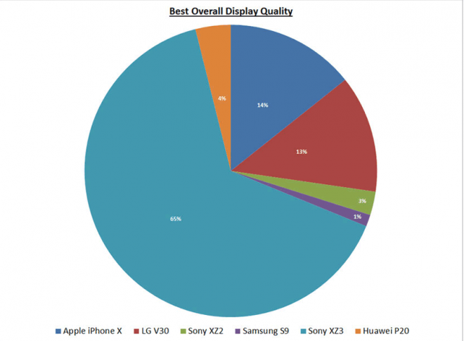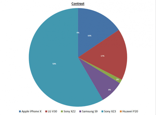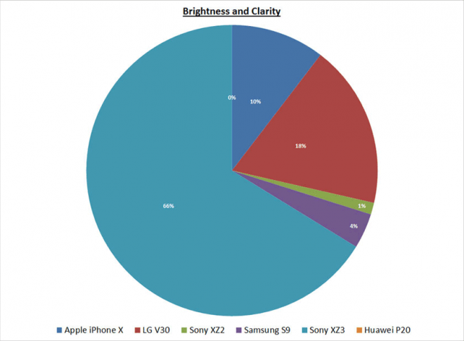以下是Independent Strategy Analytics針對Apple iPhone X、LG V30、XZ2、Galaxy S9、Xperia Z3、華為P20與XZ3在亮度/清晰度、色彩還原度、對比、鮮豔度、整體表現,這份資料來自202位消費者的意見調查/投票數,過程中參與者不會知道手機品牌,每支手機亮度是在最亮狀態,圖片設定全部採預設值,測試圖片與影片同時在這七款手機同步播放。