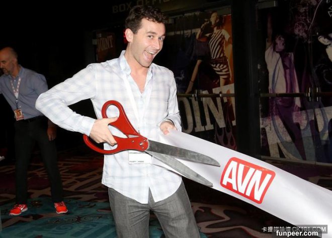 ▼男優James Deen 剪開綵帶,宣佈2015年的成人娛樂博覽會正式開始