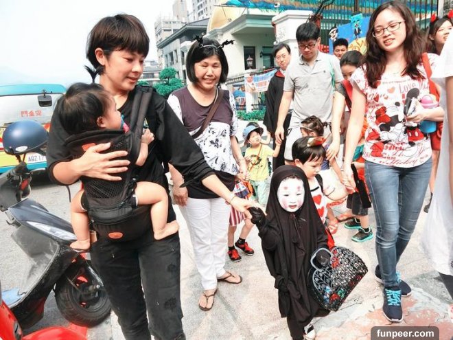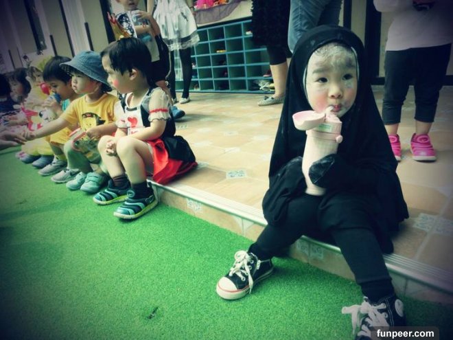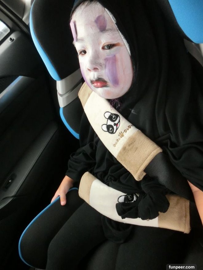 這名小朋友名叫萌萌,因為非常喜歡電影《神隱少女》,才想要扮成淡定的「無臉男」。而且為了求逼真,萌萌甚至還面無表情,卻沒想到,沒有人認出她,也沒有人敢靠近。