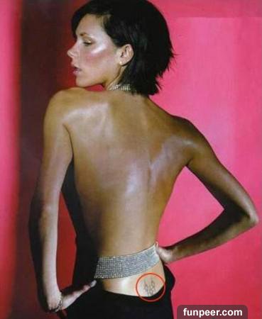 辣妹維多利亞·貝克漢姆在腰部最下端紋上了三個八角的小星星,這三個星星分別代表維多利亞自己、丈夫貝克漢姆和他們的兒子佈魯克林。辣妹的紋身作品——是希伯來語“我愛我的”和“我愛的是我的”,這非常適合她的女孩兒個性。kim saigh說,女人更喜歡用文字來做紋身,這種紋身真的很漂亮和舒服,同時很有意義。維多利亞的紋身既性感又優雅,是一款非常性感的紋身。