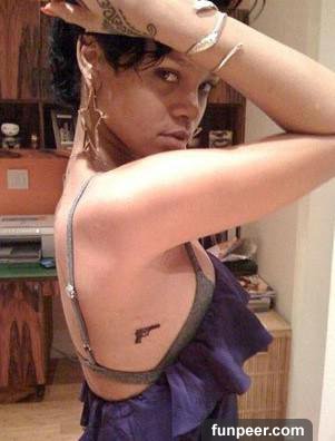 與歌手克里斯·布朗的恩怨糾紛曝光後,蕾哈娜性格轉變,作風大膽,現在更是有槍傍身,不過這槍並不是真槍,而是紋在她腋窩下的新紋身圖案。蕾哈娜的刺紋是在洛杉磯的“浜浜”工作室完成的。蕾哈娜身上的紋身很多,包括耳旁的小星星圖案和腳踝上的音樂符號。她曾說:“我是如此痴迷紋身。它是一種文化,是我研究的文化。”