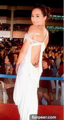 關穎曾以一襲白色的大膽露背裝閃亮出場,隱隱約約露出臀部刺青,瞬時搶盡風頭,成功地引起了媒體的猜測與關注。不得不說,這似乎也成了女星大出風頭的特殊招式了。
